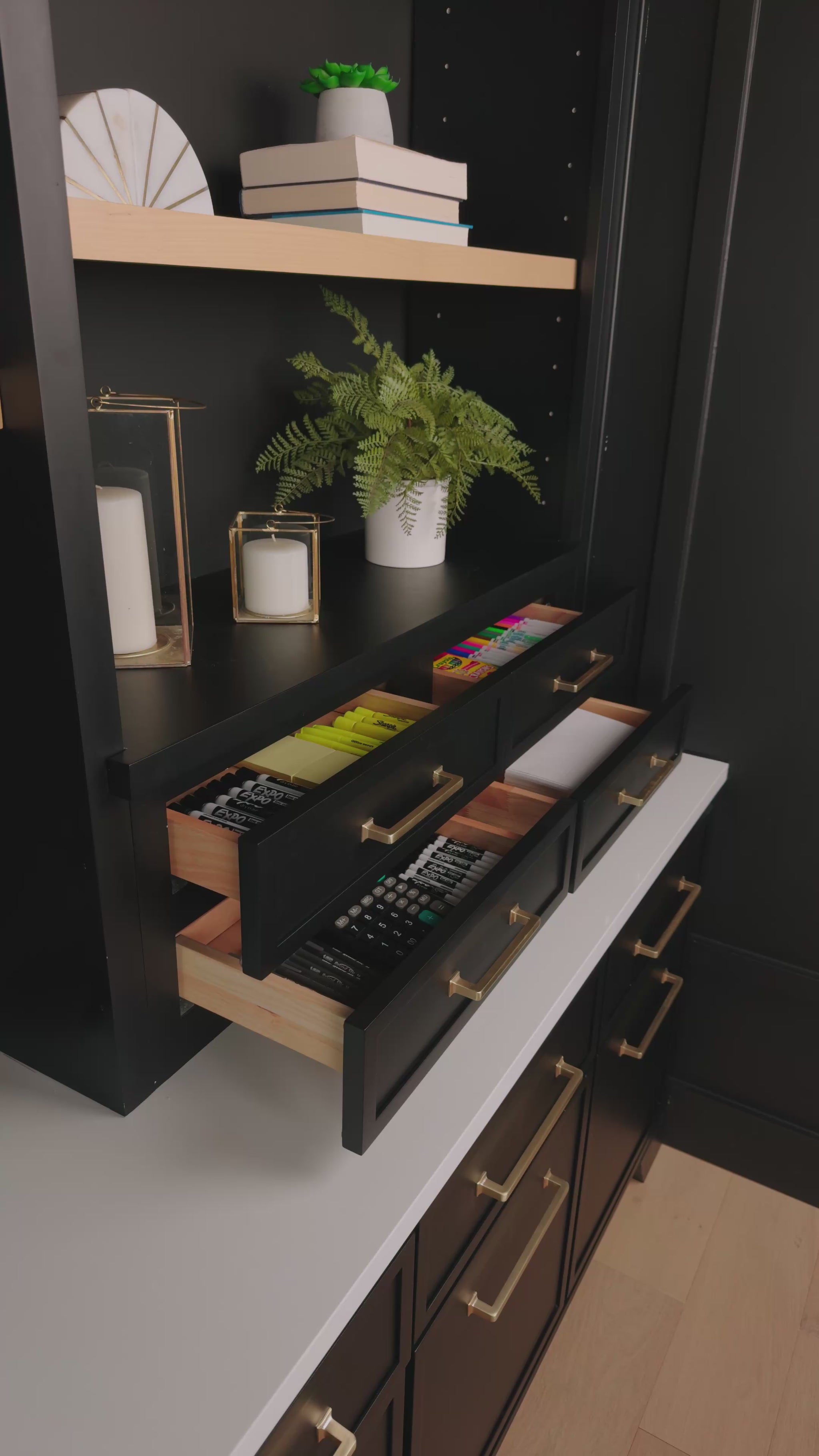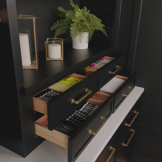 - Concealed undermount full extension drawer glides with a soft-close feature.