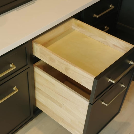 - Concealed undermount full extension drawer glides with a soft-close feature.